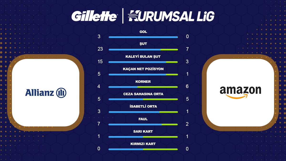 12 Nisan Pazar günü Maltepe Ay Işığı Spor Tesisleri’nde oynanan karşılaşmada Allianz maça istekli ve kontrollü başladı. İlk dakikalardan itibaren oyunu rakip yarı sahaya yıkan ekip, aradığı golü 19. dakikada buldu. Cihan Kayadeleren’in golüyle öne geçen Allianz durumu 1-0'a getirdi. İlk yarıda oyun disiplinini koruyarak skor avantajını sürdürdü. İlk yarı bu skorla tamamlandı. Amazon Türkiye ilk yarıda ortaya koyduğu mücadele ile izleyenlerin alkışını aldı.