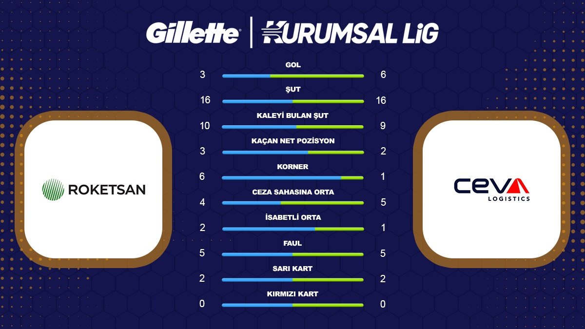 Gillette Kurumsal Futbol Ligi’nde çeyrek final maçında Roketsan ile CEVA Logistics takımları karşı karşıya geldi. 6-3'lük skorla kazanan CEVA Logistics yarı final biletini alan taraf oldu.