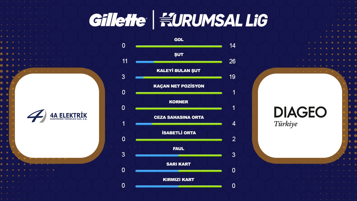 Gillette Kurumsal Futbol Ligi Sonbahar Sezonu’nun ilk haftasında 4A Elektrik ile Diageo Türkiye takımları karşı karşıya geldi. Müsabaka, Diageo Türkiye'nin 14-0’lık üstünlüğüyle sonuçlandı.