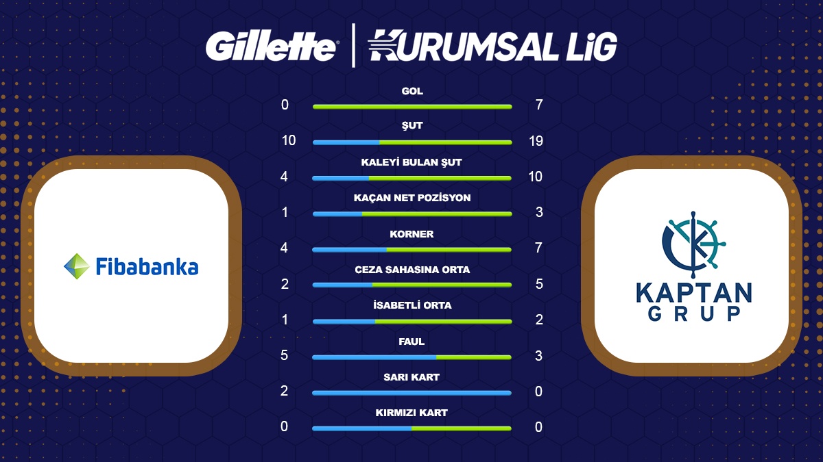 Gillette Kurumsal Futbol Lig 2026 İlkbahar sezonu A Grubu’ndaki mücadelede Fibabanka ile Kaptan Grup karşı karşıya geldi. Karşılaşmada sahadan 7-0’lık net bir galibiyetle ayrılan Kaptan Grup, grup aşamasına adeta gövde gösterisi yaparak başladı.