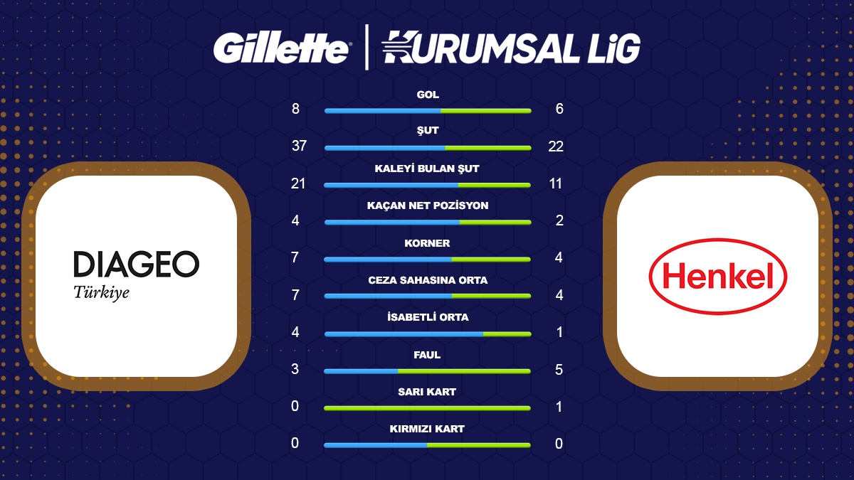 Gillette Kurumsal Futbol Lig 2026 İlkbahar sezonu E grubu 3. hafta maçında Diageo Türkiye ile Henkel takımları karşı karşıya geldi. 8-6’lık skorla kazanan Diageo Türkiye 3 puanı alan taraf oldu.