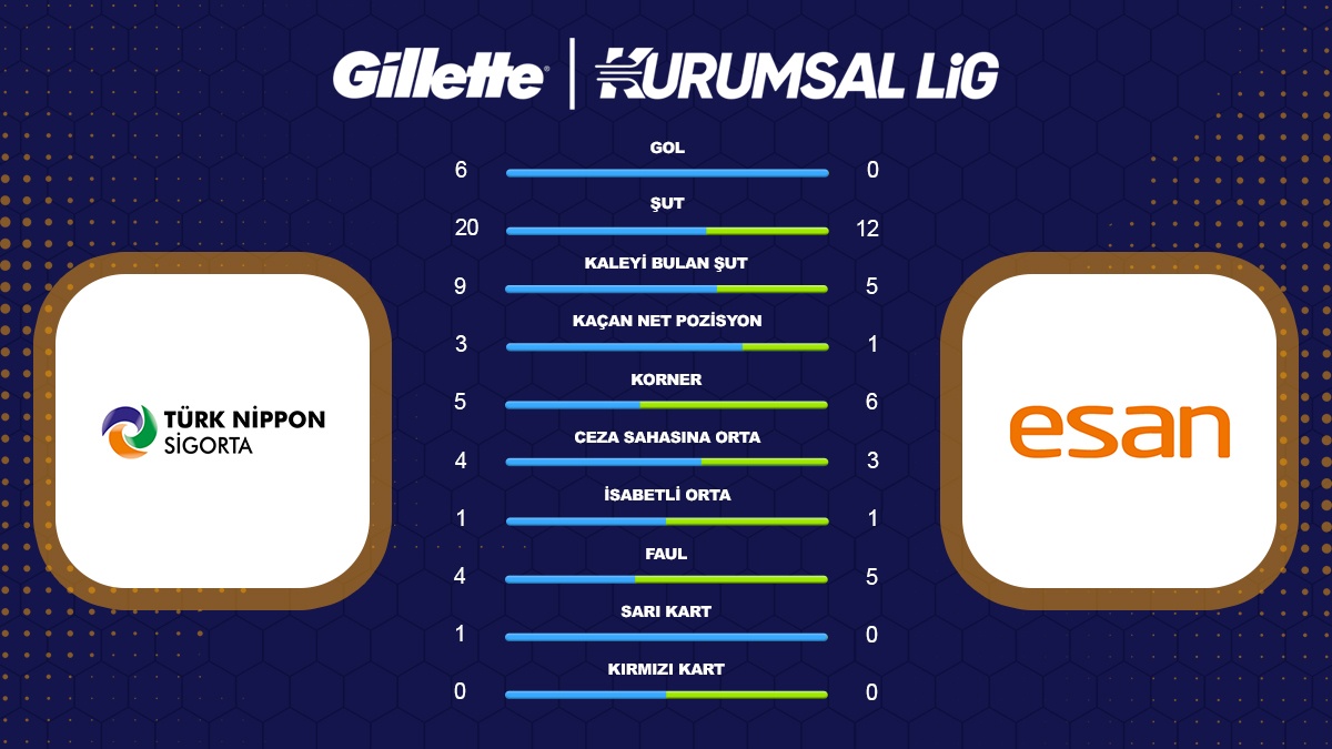 Gillette Kurumsal Futbol Lig 2026 İlkbahar sezonu E grubu 3. hafta maçında Türk Nippon Sigorta ile Esan Eczacıbaşı takımları karşı karşıya geldi. 6-0’lık skorla kazanan Türk Nippon Sigorta 3 puanı alan taraf oldu.