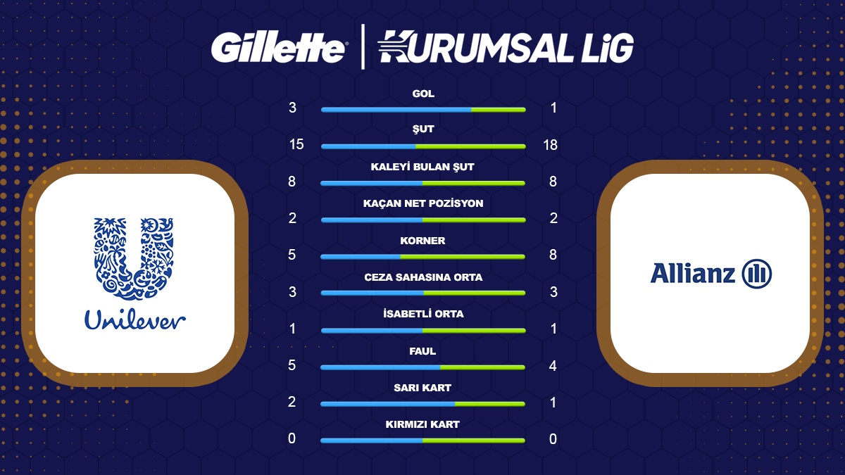 Gillette Kurumsal Futbol Lig 2026 İlkbahar sezonu D grubu 3. hafta maçında Unilever ile Allianz takımları karşı karşıya geldi. 3-2’lik skorla kazanan Unilever 3 puanı alarak grubu lider tamamladı.